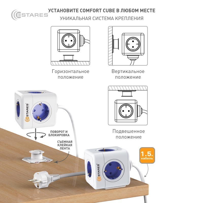 Накладной поворотный механизм позволяет монтировать удлинитель на горизонтальные и вертикальные поверхности и удобно использовать.