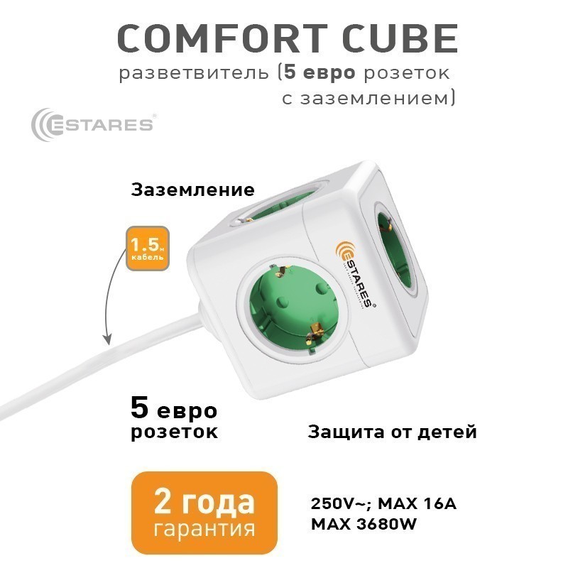 Разветвитель на 5 евророзеток с заземлением, кабель 1,5 метра с евровилкой