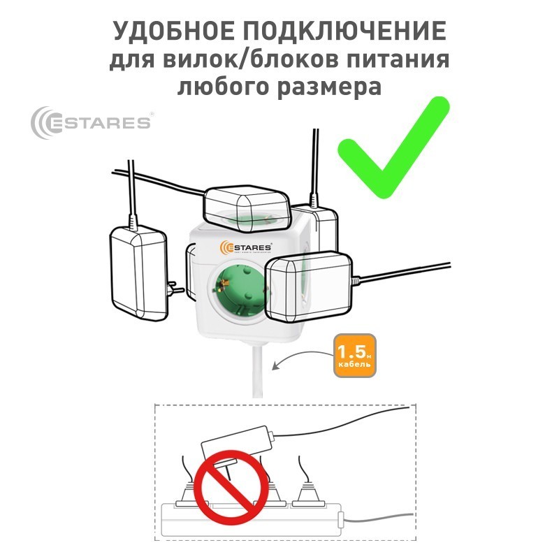 Удобный разветвитель в форме куба позволяет подключать блоки питания разных размеров одновременно.