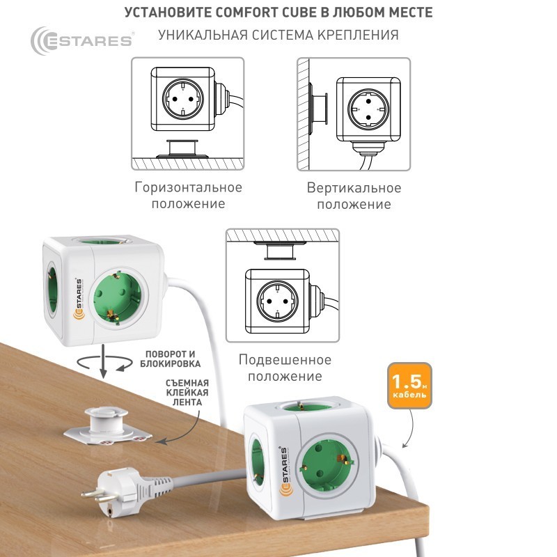 Накладной поворотный механизм позволяет монтировать удлинитель на горизонтальные и вертикальные поверхности и удобно использовать.