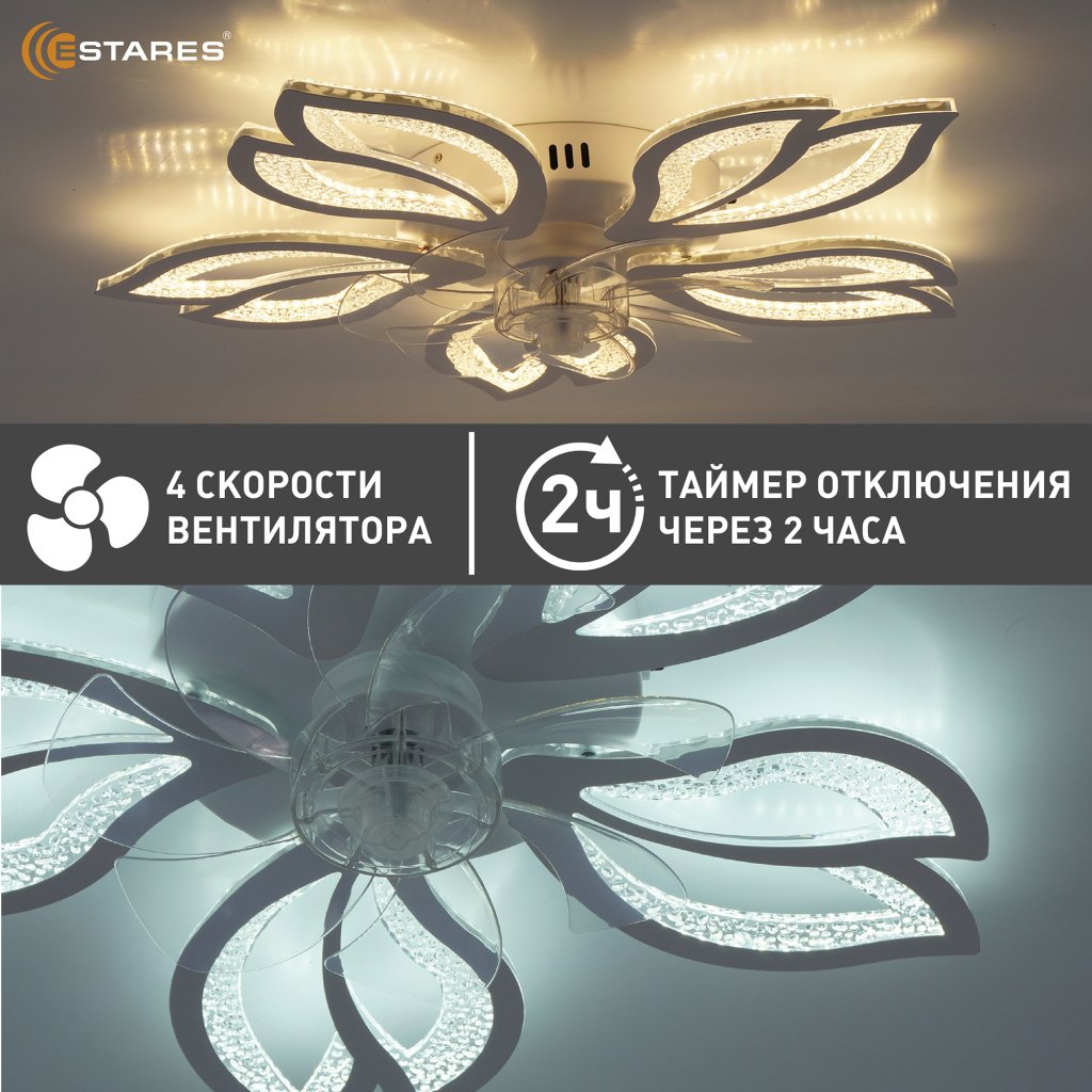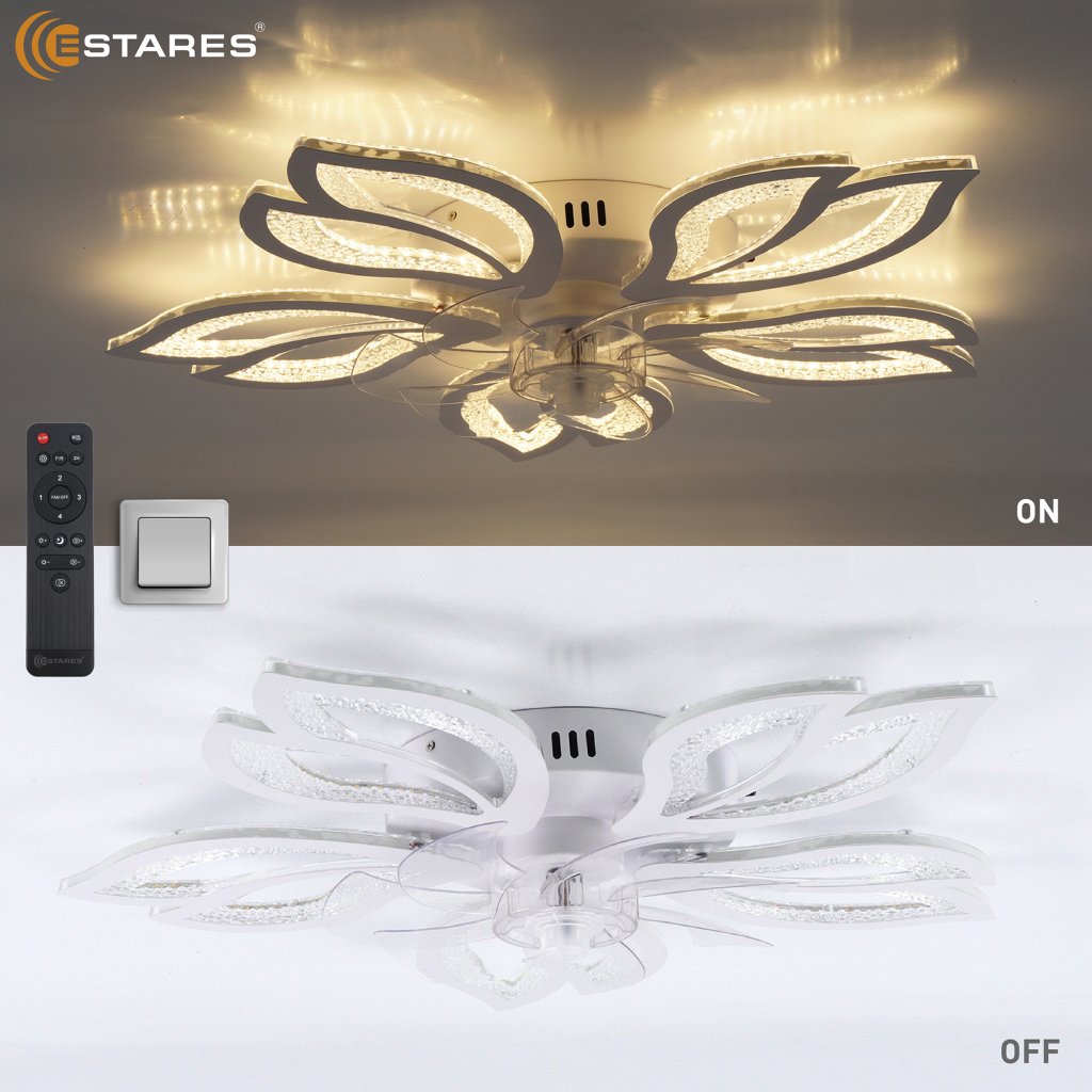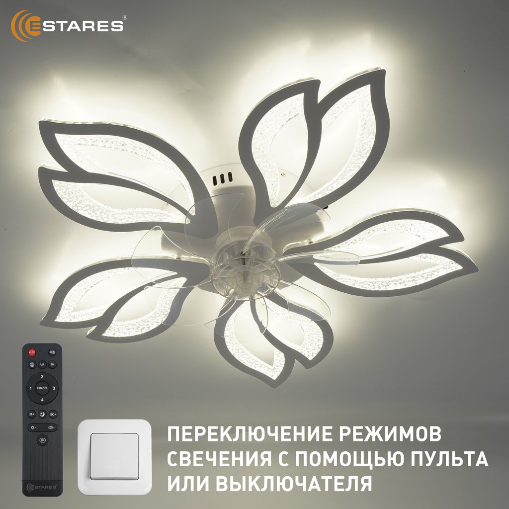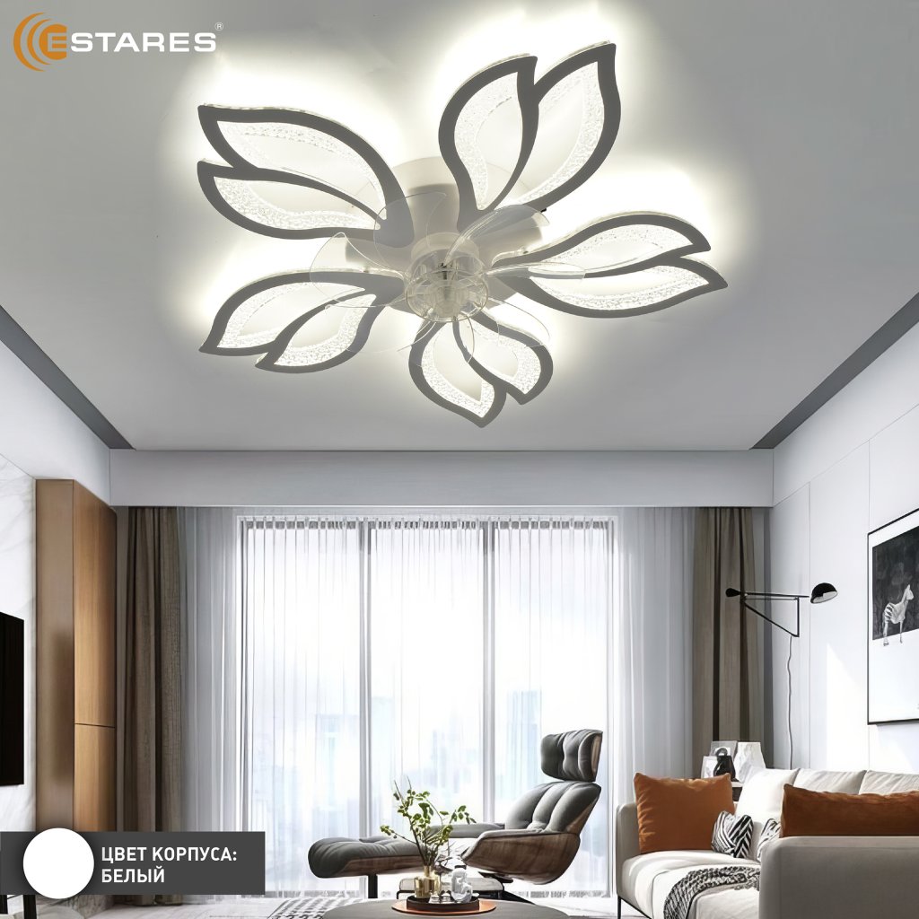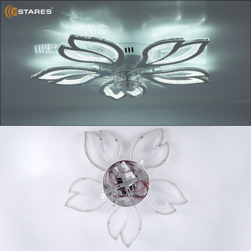 Уникальной особенностью является складываемые лопасти вентилятора. В выключенном состоянии вентилятор не видно в люстре.