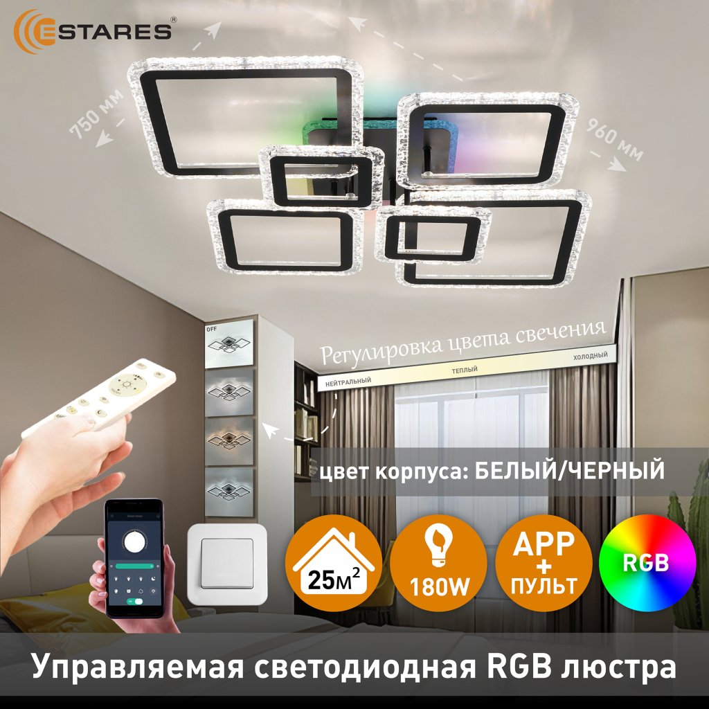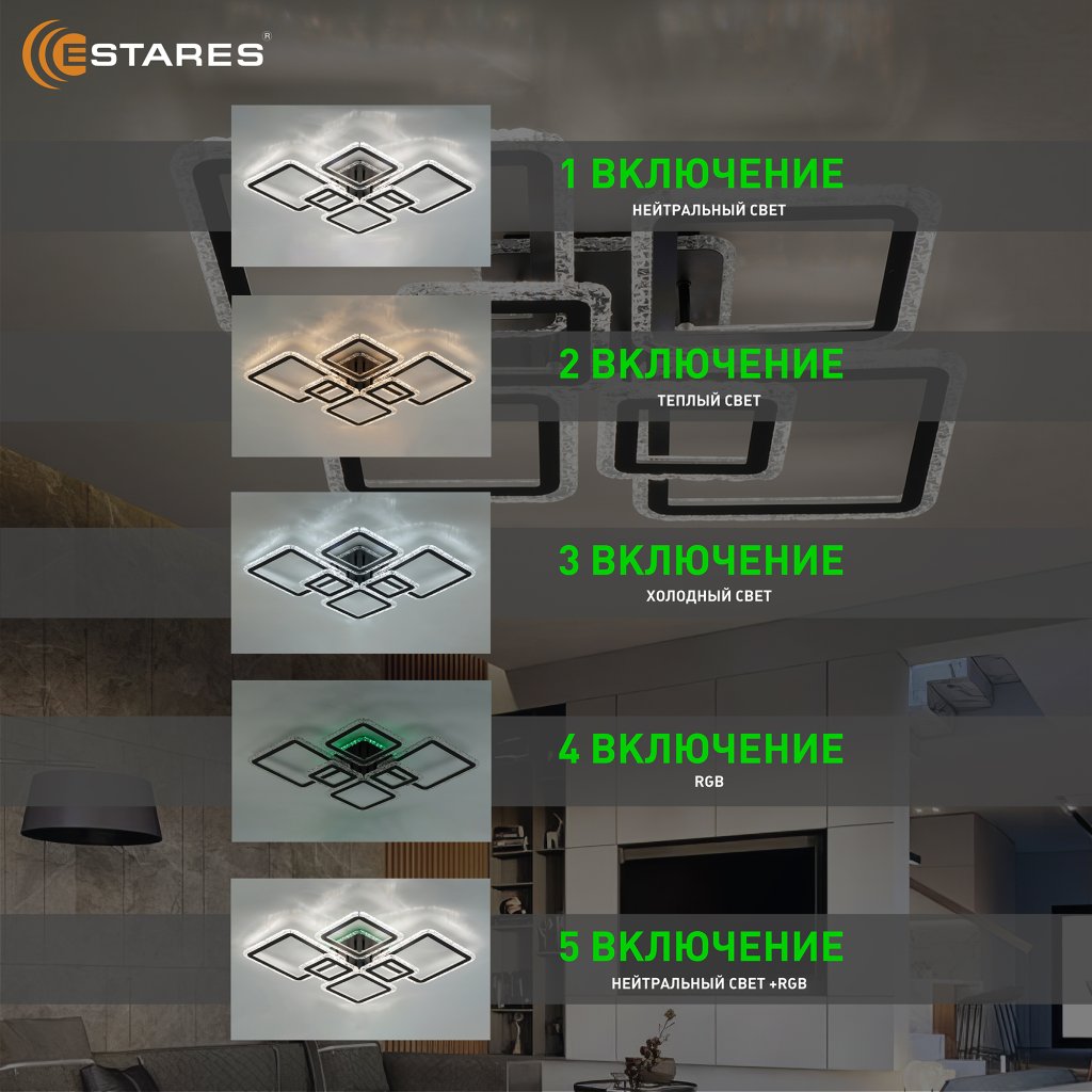 - управление с выключателя (нейтральный свет, холодный свет, теплый свет, RGB, нейтральный + RGB)