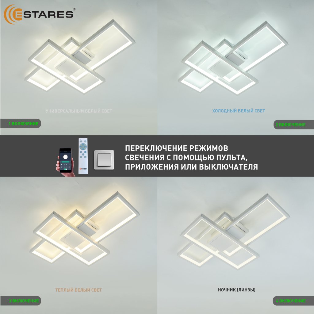 - управление с выключателя (нейтральный свет, холодный свет, теплый свет, ночник)