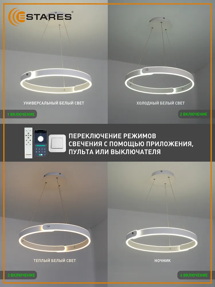 Главное отличие от обычных люстр подвеса Estares – это пульт, через который можно управлять подсветкой на расстоянии. Есть следующие возможности: