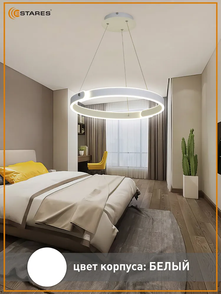 Светодиодная потолочная подвесная люстра с пультом управления бренда Estares – важный элемент интерьера, способный преобразить пространство и подчеркнуть его стиль. Это современное и удобное решение для освещения, сочетающее эстетику и функциональность. Свет будет распределяться равномерно – люстра обеспечивает высокую яркость, а возможность регулировать высоту поможет адаптировать подсветку под различные потребности и особенности помещения. Оригинальный, но при этом сдержанный дизайн делает ее центром притяжения внимания в комнате.